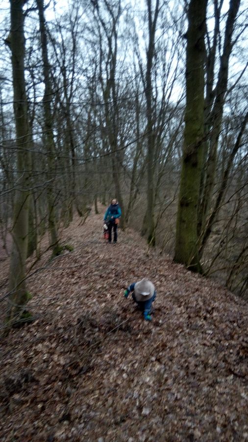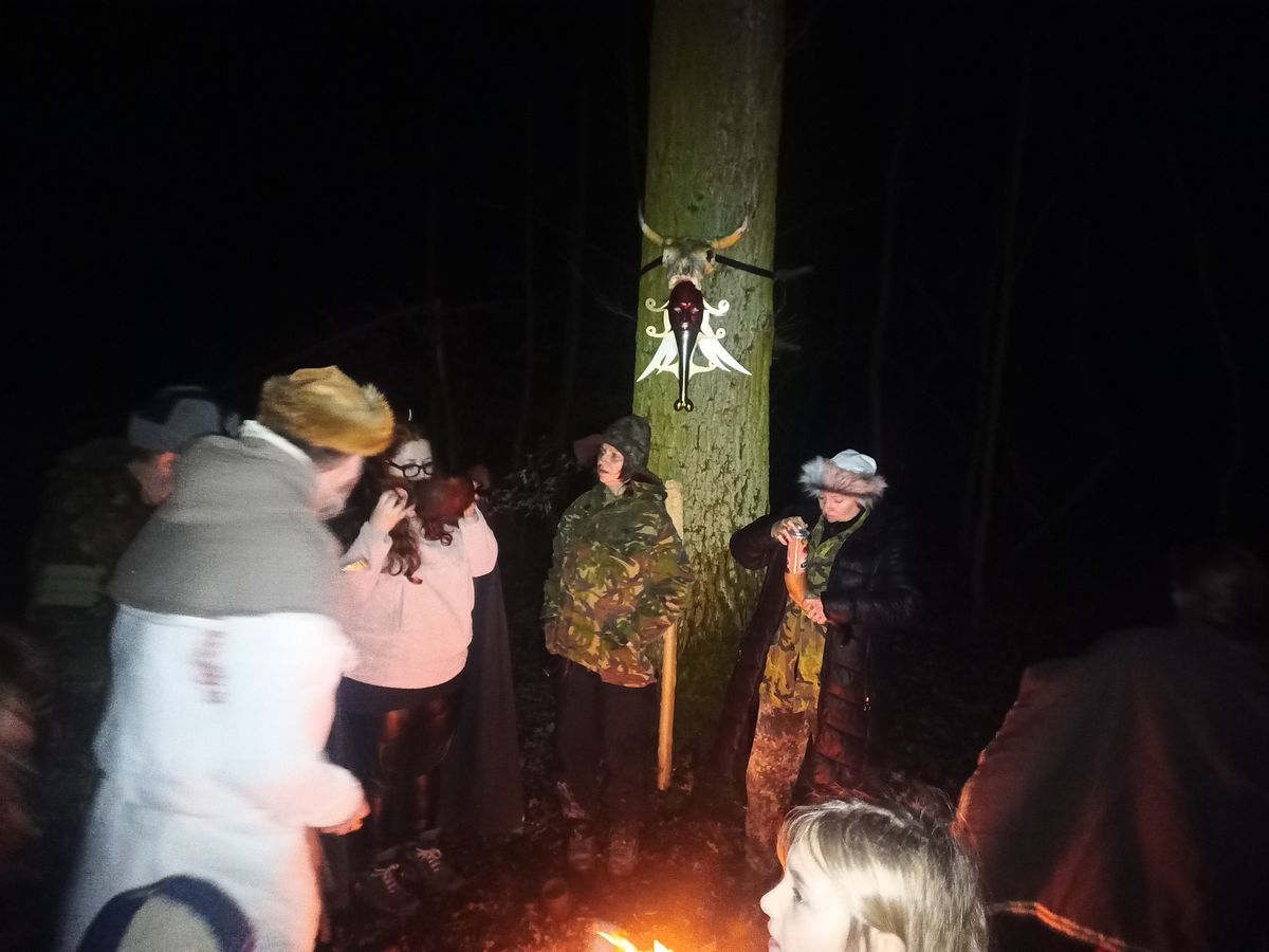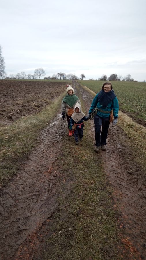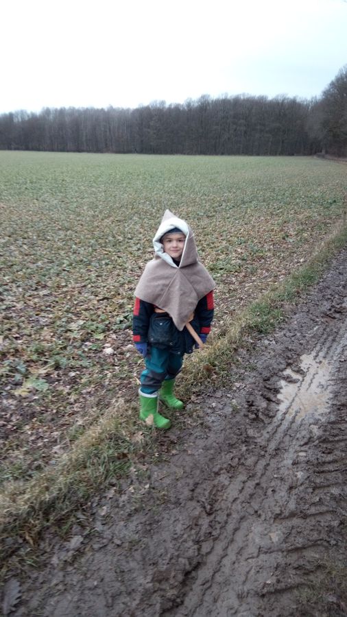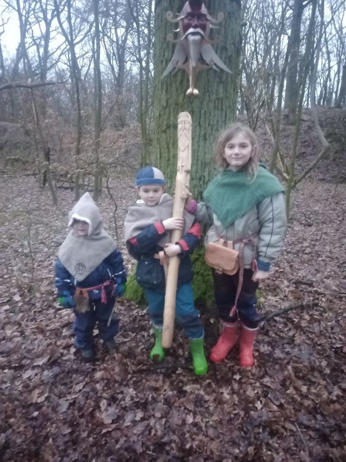 Svátky k uctění boha Velese jsou vždycky proměnlivé, jak jen zimní příroda umí být. Někdy jsou bílé, jindy umazané od bláta, někdy mrzne, až praští, jindy teploty připomínají spíš duben, než únor. Letošní Velesův den tak nebyl úplně zimní, ale teplý, trochu uplakaný a hlavně blátivý. Poznali jsme to už po příjezdu na louku u cesty, kde se tradičně nechávají vozidla. Pouštět se příliš daleko od štěrkem zpevněného nájezdu se nevyplácí, což jsme brzy poznali, když se nám sice kola točily, ale stáli jsme na místě. Naštěstí se jako skautská rodina řídíme heslem Buď připraven!, proto jsme pod kola hodili sněhové řetězy a s jejich pomocí (a taky díky přítomnosti silné ženy Radky, která auto vytlačila) jsme se za chvilku z luční pasti dostali. Děti jsme oblékli ve svěžím ledovém deštíku a velmi dotírajícím vichru, hodili jsme na sebe přes moderní funkční oblečení něco dobových kousků a rychle jsme vyrazili směrem k lesu po zemědělskou technikou rozorané polní cestě.
