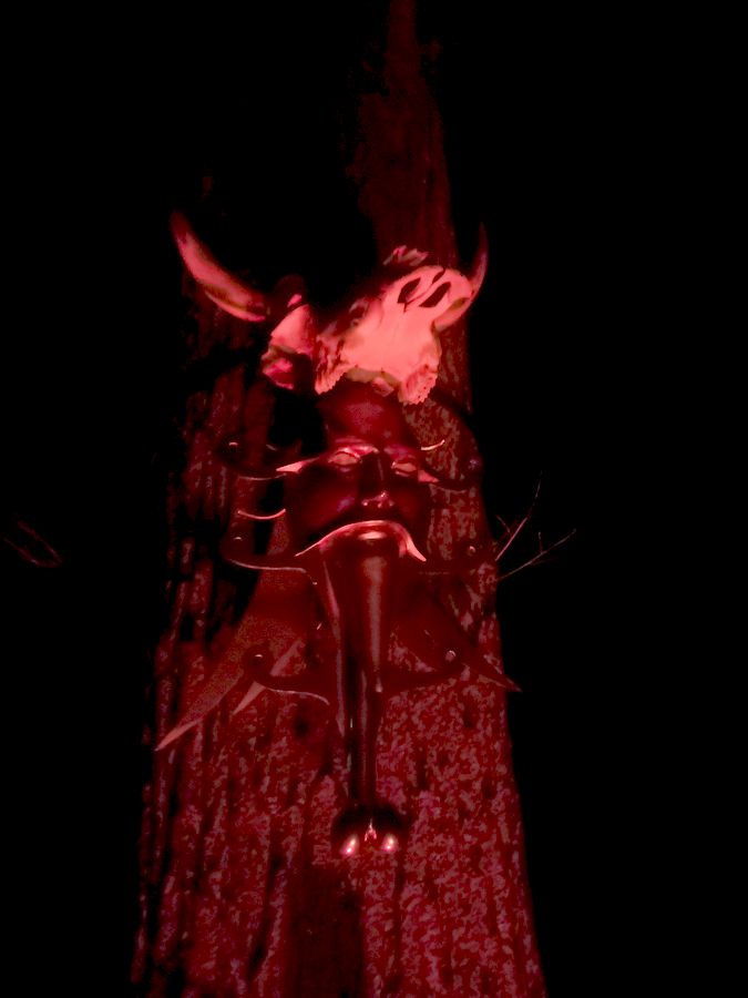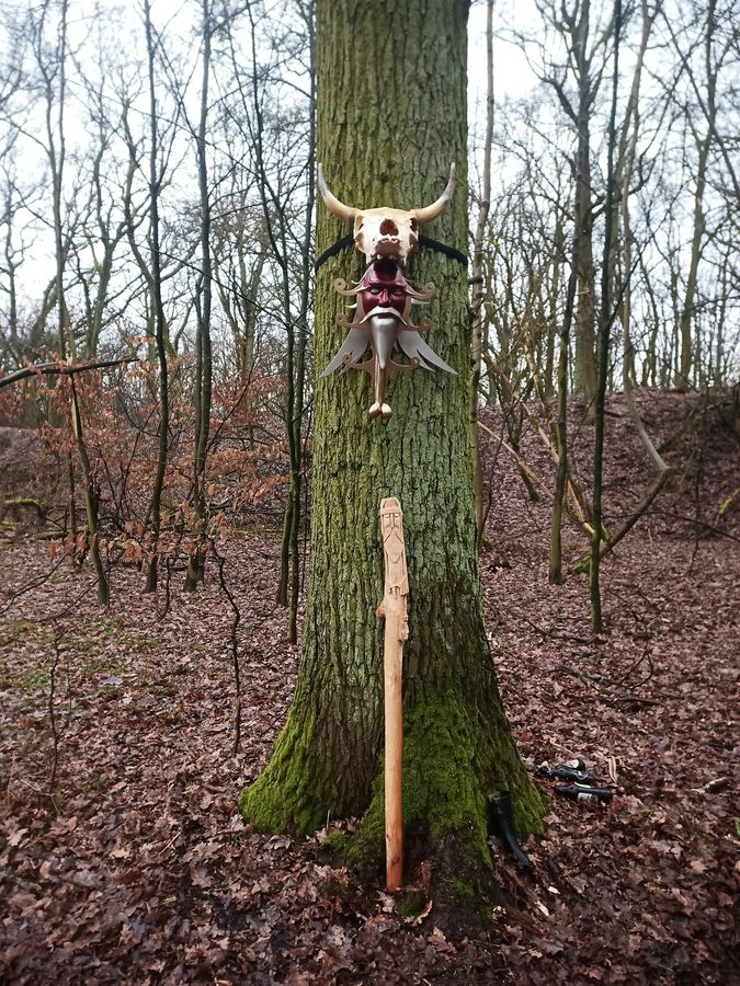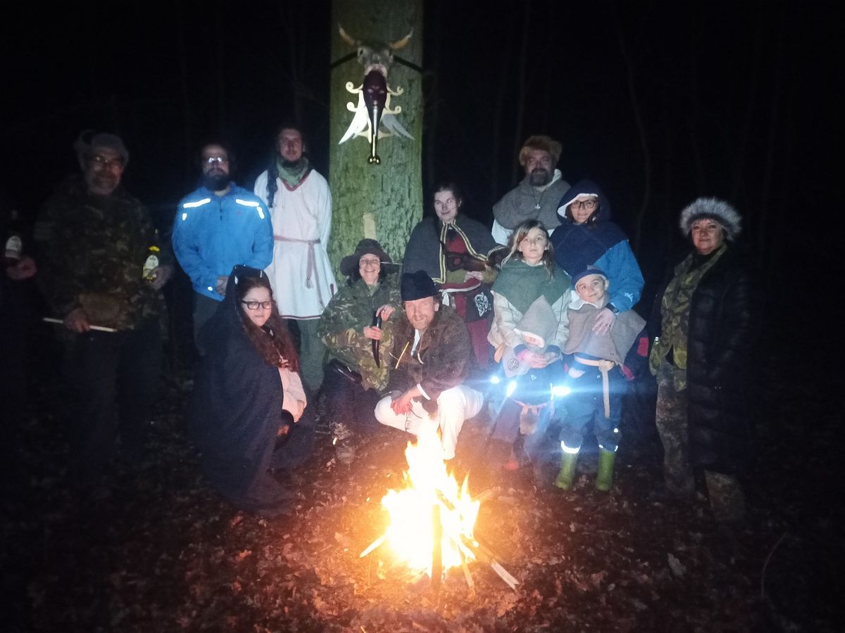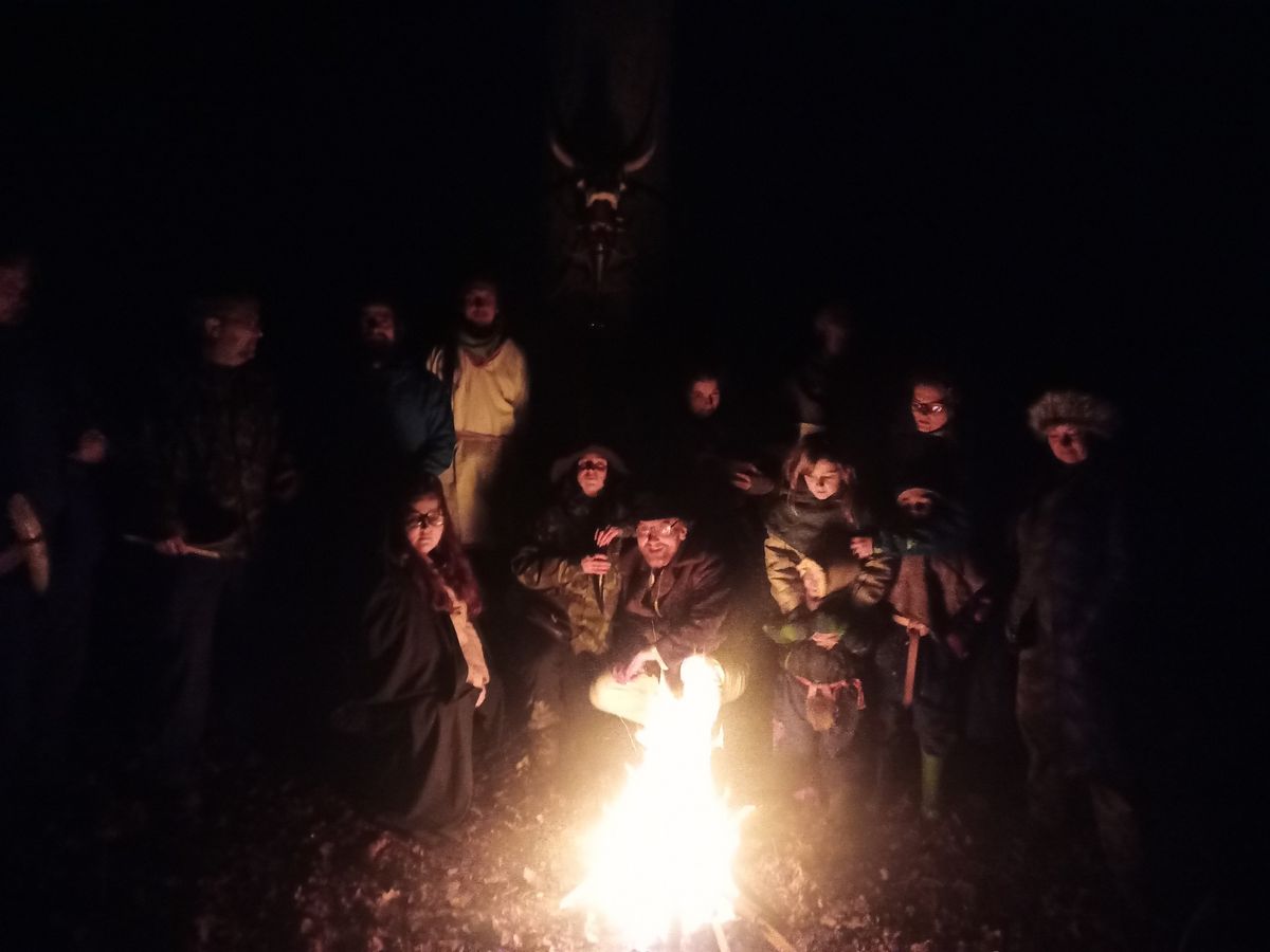 Procházka v závětří listnatého lesíku po koberci podzimního spadaného listí a po monumentálních valech už byla o dost příjemnější, než pohyb v otevřeném terénu, zanedlouho už jsme spatřili sloup kouře z ohniště a barevně probleskující stany v jinak zlatavém lese. Uvítali jsme se se starými známými tvářemi z Rodné víry a rádi se seznámili s jihočeskou pohanskou delegací, kterou s sebou tentokrát přivezl Rostislav. O Frostíkovi, známém to jihočeském pohanském obrozenci, jsme již mnoho slyšeli, proto bylo příjemné se s ním poznat osobně, stejně jako s jeho průvodkyněmi. V družném hovoru, koštování piva a neustálém sekýrování našeho pohanského potěru, aby nespadl do ohně, že nebude už v pořadí asi šestá svačinka a že šermovat se zapáleným klackem není dobrý nápad, krásně uplynul čas až k soumraku, kdy už bylo v magickém češovském lese cítit blížící se obřad. V tuto chvíli Frostík prezentoval svůj výrobek, nádherně vyvedenou modlu Velese, inspirovanou dobovým nálezem přívěšku ze Slovenska, tuto modlu pak v obřadišti připevnil ke stromu nad stávající Velesovu modlu z dláta Veleslavina. Obřad mohl začít.