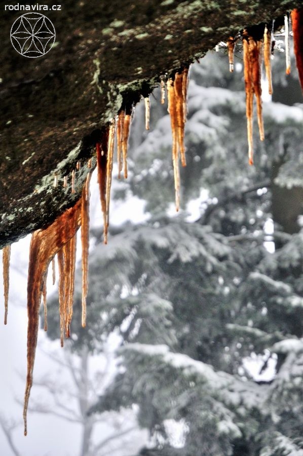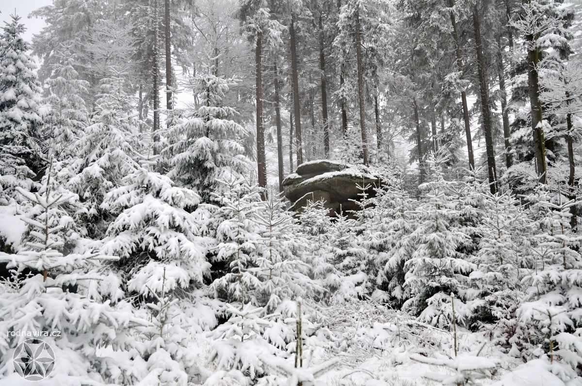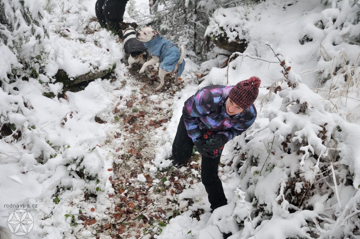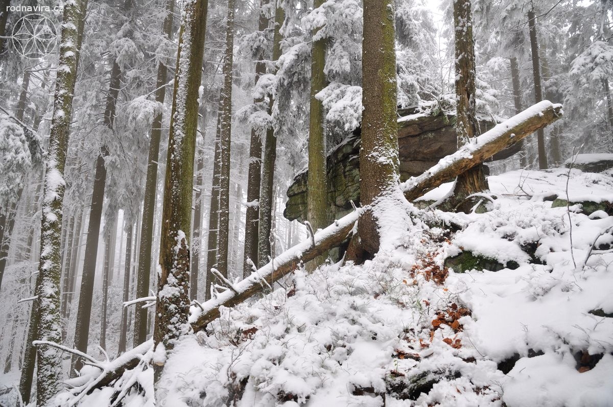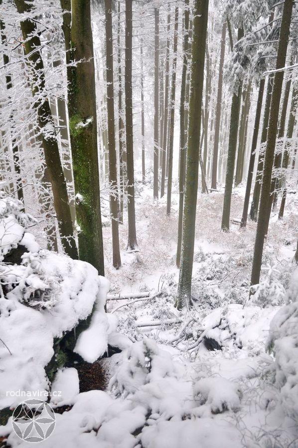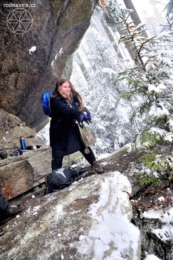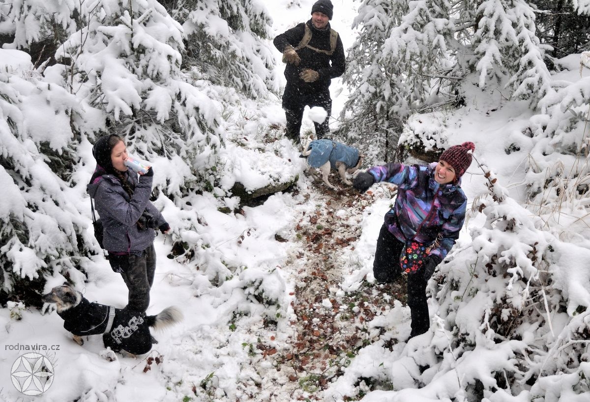 Někdo takhle narychlo mohl, někdo ne, každopádně se nás následující den, v neděli, na úpatí hory Vysoké v Novohradských horách sešel docela slušný hlouček. A právě na tuhle horu, na místo, které se samo nabídlo jako obřadiště, jsme vyrazili. Protože jsme pár set metrů vystoupali, Zima se nám ve své kráse přihlašovala stále víc a víc. Ostatně zde víc promluví fotky, za něž děkuji zejména Veleslavě, tak se můžete sami pokochat.